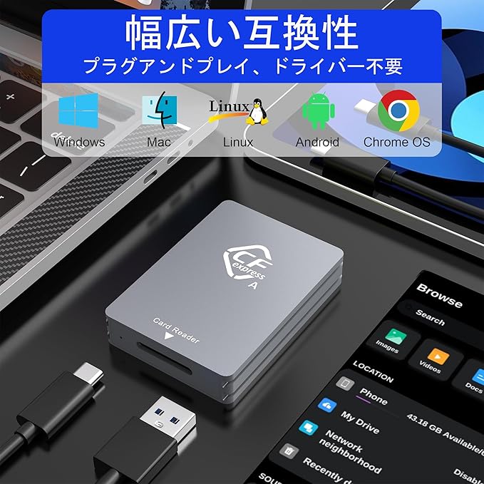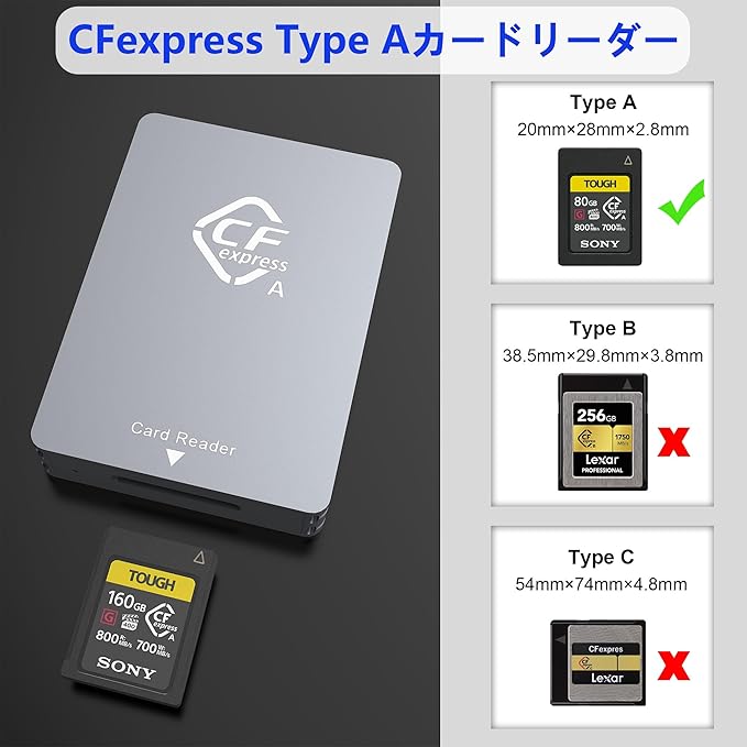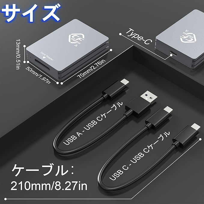 製品仕様- CFexpress type a カードリーダーUSB3.2 Gen2準拠、10Gbpsの速度に対応。USB3.0/2.0規格との下位互換性(USBバスによる速度制限あり)。- Windows XP/Vista/7/8/8.1/10/11, Mac OS, Linux, Android などに対応。- プラグアンドプレイで、ドライバーやアプリのインストールは不要です。- アルミニウム合金カバーは、USB3.1 GEN2 CFexpressリーダーを作成します。より耐久性と高品質。- サイズ:2.75" (L)*1.96" (W)*0.51" (H)/70 (L)*50 (W)*13 (H)mm, ケーブル長:20 cm.カードスロットの互換性* CFexpressスロット:CFexpress Type Aカードご注意ください*当社製品はCFexpress Type Aカードの読み取りをサポートしていますが、CFexpress Type BカードおよびCFexpress Type Cカードの読み取りはサポートしていません。* データ転送中はLEDインジケーターが点滅します。* データ転送速度は、メモリーカード本体とパソコンのUSBポートの速度に依存します。CFexpressカードリーダーとのユニバーサル互換性標準的なUSB Type-CとUSB-Aのデュアルケーブルを搭載したCFexpressカードリーダーは、USB-Cのスマホ/タブレット/ノートパソコンとUSB-Aのデバイスで、いつでもどこでも写真/動画を閲覧・編集することが可能です。2TBのカード容量と10Gbpsの安定した転送を実現容量2TBの大容量CFexpressカードに対応。10Gbpsの高速データ転送により、あなたの作品を友人や家族とすぐに共有することができます。軽量・コンパクト設計デュアルスロットCFexpress type a カードリーダー typec、スリムボディデザインで持ち運び可能な休日や出張に。内容:1 x CFexpressタイプAカードリーダー1 x USB C - USB-Cケーブル1 x USB C - USB-Aケーブル1 x ユーザーマニュアル