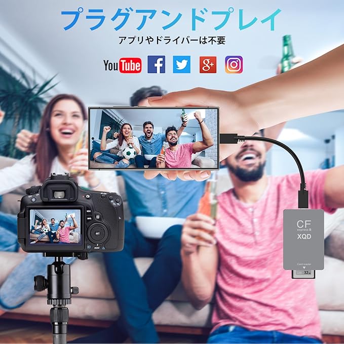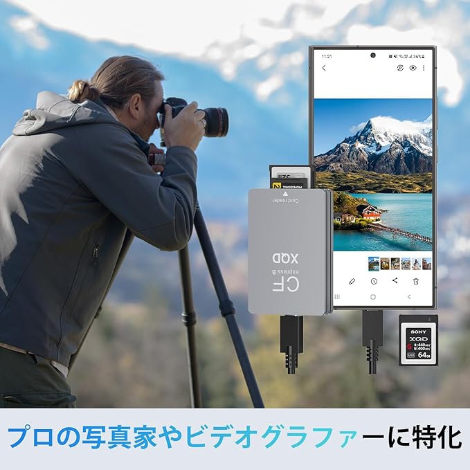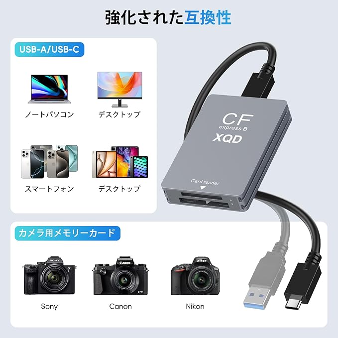 【プラグアンドプレイ】追加のドライバーやソフトウェアのインストールは不要です。このcf sd カードリーダーーをデバイスに接続するだけで、すぐにファイルの転送を開始できます。最大 2TB のカード容量をサポートし、すべての cfexpress タイプ b および SD カメラカードと簡単に互換性があります。写真/ビデオをデバイスに簡単かつ迅速に転送し、カメラの画像/ビデオをどこからでもソーシャルメディアで共有できます。外出先でもデジタルコンテンツを簡単に管理できます。