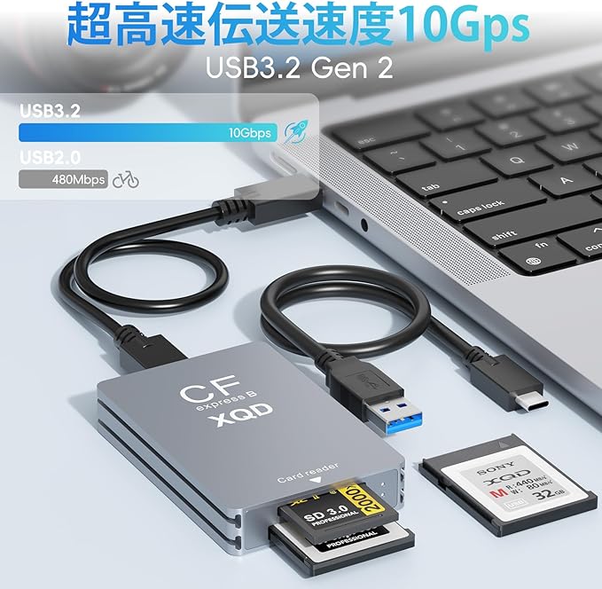 【CFexpress カード用の 10 Gbps超高速データ転送】USB 3.1 Gen2テクノロジーを搭載したこのCFカードリーダーは、最大10Gbpsの超高速データ転送速度を保証します。JPEG、RAWなどの標準的な写真形式、H.264やMPEG-4などのSDおよびHDビデオ形式の高速転送をサポートします。4Kや8Kなどの高品質の画像やビデオを高速かつ安定して転送します。長い待ち時間に別れを告げ、大きなファイルを転送する際の迅速かつ効率的なワークフローをお楽しみください。