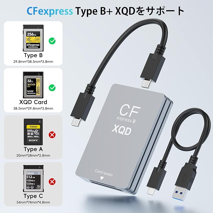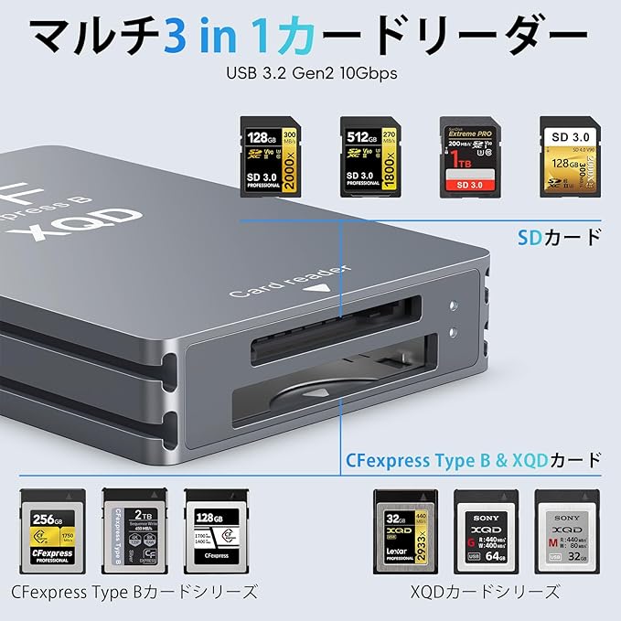 【2025新設計】CFexpress Type B & XQD & SD カードリーダ 3 in 1、デュアルスロットUSB3.2 10Gbps 高速転送 CFexpress Type B cfカードリーダー アルミニウム タイプ cfカード アダプター cf sd XQD カード Android/Windows/Mac OS/Linux対応、USB C - USB C/USB Aケーブル付き | KAZESHOP