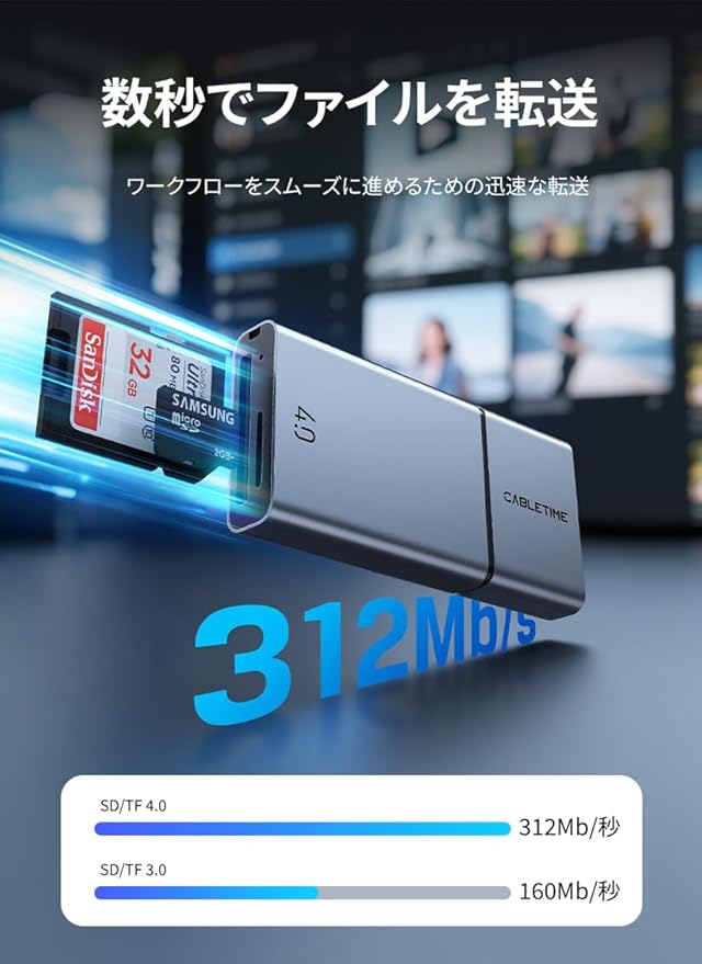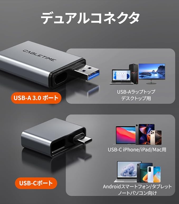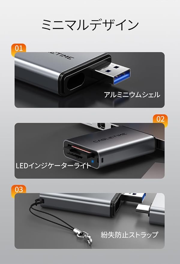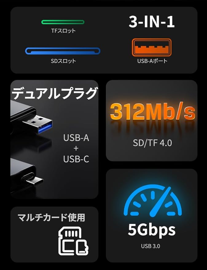 モデル番号 / SKU:CB48G/CT-ACCD3-AG 入力:USB C + USB A 出力:1 SD/TF 4.0、1 USB 3.0 転送速度:312Mb/s 材質:アルミニウム + ABS 保証:メーカー2年間保証