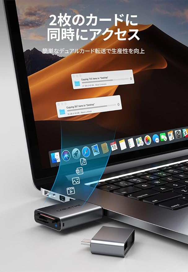 3-in-1 USB-A & USB-C カードリーダー。 カメラのSDカードからSNSへ写真を転送する時も、現地でドローンの映像をバックアップする時も。 USB-AとUSB-Cデバイスをシームレスにデータ転送。 アルミニウムシェルで堅牢性に優れたカードリーダー。iPhone/iPad対応