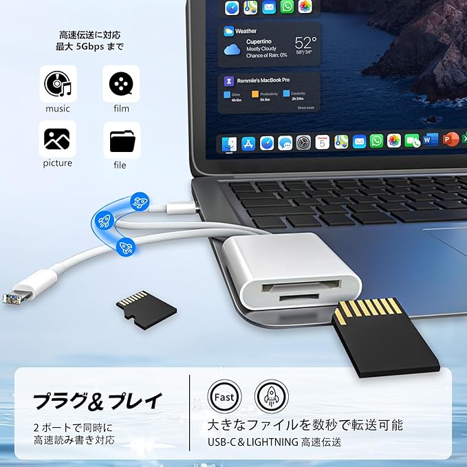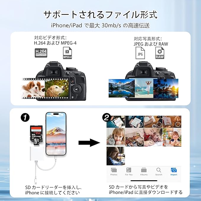 ■ 高速双方向転送性能 伝送速度:20-30MB / 秒(USB3.0 対応で USB2.0 比約 10 倍速) 双方向機能: iOS 13 以降:SD/TF カード⇄スマホの双方向転送(写真・ビデオはもちろん、Word/Excel/PDF などの文書も対応) iOS 9.2~12.4:カード→スマホの単方向転送のみ 大容量対応:最大 1TB の SD/TF カードをサポート(Wi-Fi SD や Sony 製 SD カードを除く)