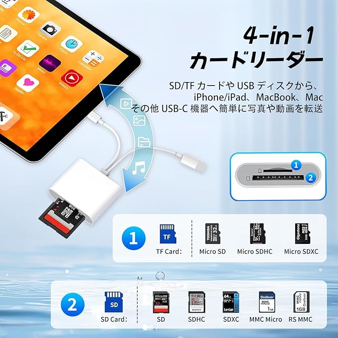 ■ 幅広い機器互換性 iOS デバイス:iOS 9.2 以降対応(i-Phone 16/15/14 シリーズ、iPad Pro/Air/Mini など) USB-C 機器:i-Phone 15、iPad Pro、MacBook、iMac、Google Pixel、Dell XPS など Android 端末:OTG 機能付きのスマホ・タブレット