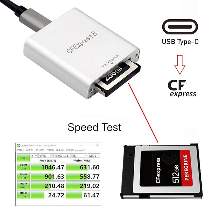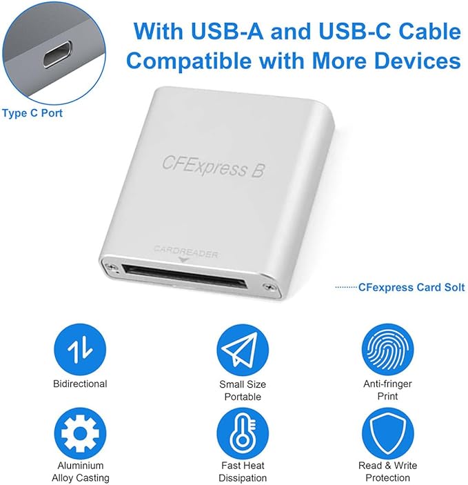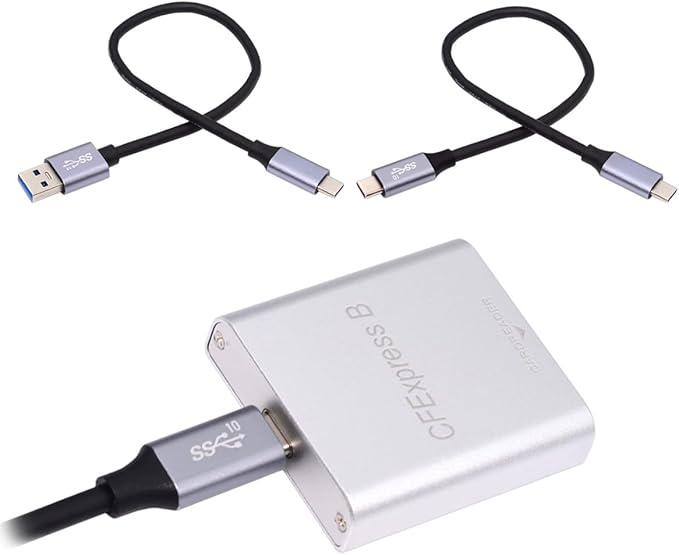 製品の用途:CFexpressカードをUSB3.0またはUSB3.1スロットに拡張するのに適しています。 (XQD/CFAカードには対応していません)。CFexpressメモリーカードUSB 3.1 Gen 2は、Windows、Mac、Linuxなどのさまざまなプラットフォームと互換性があり、PC、デスクトップ、Mac、iPadでデータ転送を容易にします。 また、タイプCコネクタにも対応しており、抜き差しが簡単です。