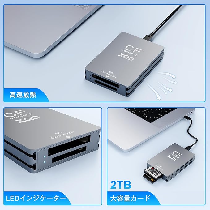 【完璧なサイズとプレミアム品質】デジタルCFexpress Type B/XQDおよびSDデュアルスロットメモリカードリーダーは、超薄型で手のひらサイズのボディデザインを採用。旅行写真撮影に携帯可能で、アウトドアや山頂などあらゆる場所でいつでも作業をサポートします。CFexpressメモリカードリーダーはアルミニウム合金シェルを採用。オールメタル設計は外観が精巧でコンパクトなだけでなく、強力な放熱性、耐圧性、耐衝撃性という利点も備えています。