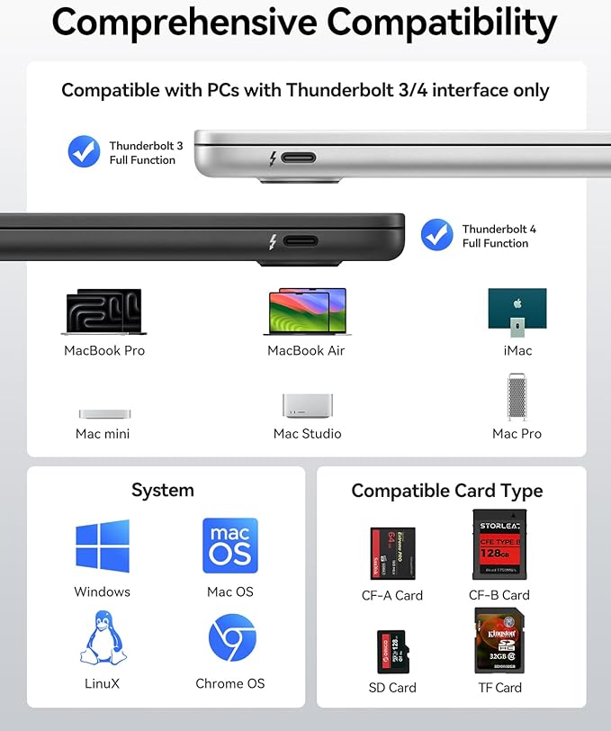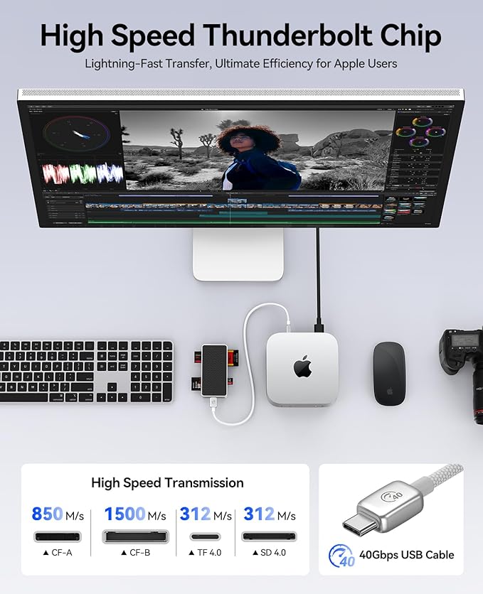 【プロ仕様の汎用性】SD カードリーダーは 先進的なThunderboltチップテクノロジーを搭載し、Mac、Windows、iPad Pro、その他40Gbps USB-Cインターフェースを持つデバイスとシームレスに接続し、幅広い互換性を確保します。(注:Thunderboltインターフェースインターフェース搭載PCのみ対応)。4K、8K、さらに高解像度のビデオの録画とリアルタイム伝送をサポートします。