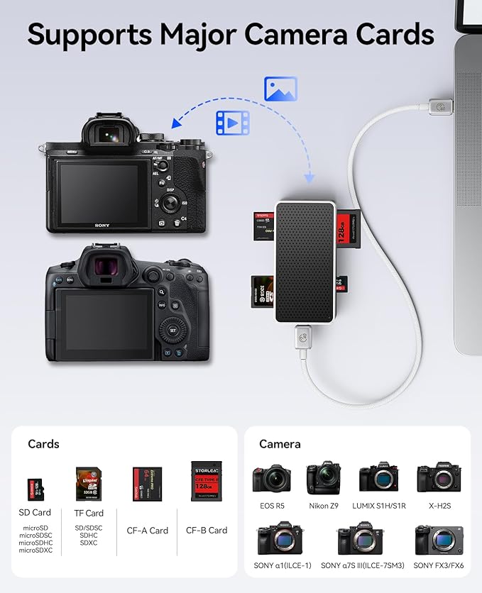 【CFexpressプロフェッショナル対応】CFexpress Type Bカードリーダー: Canon EOS R5 / Nikon Z9 / Panasonic LUMIX S1H / S1R / Fuji X-H2S / RED KOMODO-X / V-RAPTOR; CFexpress Type A カードリーダー: SONY α1(ILCE-1)/SONY α7S III(ILCE-7SM3)/SONY FX3 / FX6 など。
