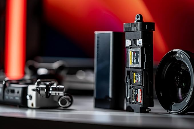 堅牢な構造とポータブルなデザイン:アルミニウム合金ボディで作られたこのコンパクトで耐久性のあるカードリーダーには、持ち運びに便利なカラビナが付属しています。CF Express Type Aカード1枚とCF Express Type Bカード1枚、SD (UHS-IおよびII)カード3枚、マイクロSDカード6枚、NANO SIMスロット2つを収納できるユニークなデザインです。