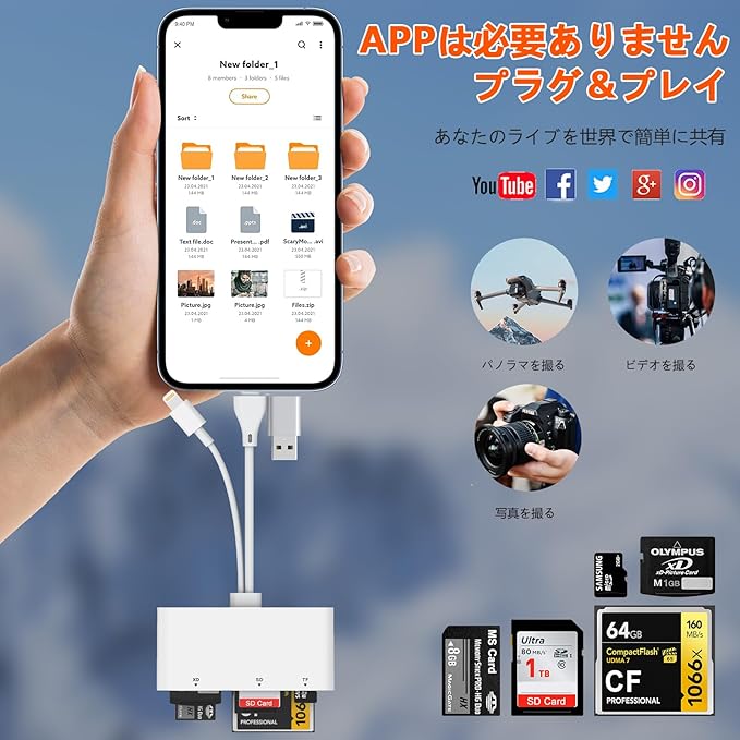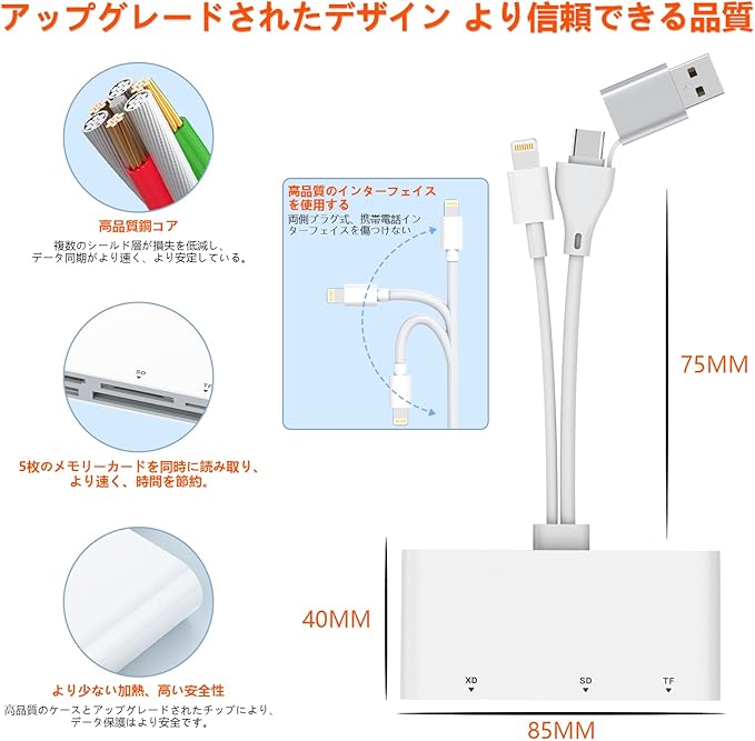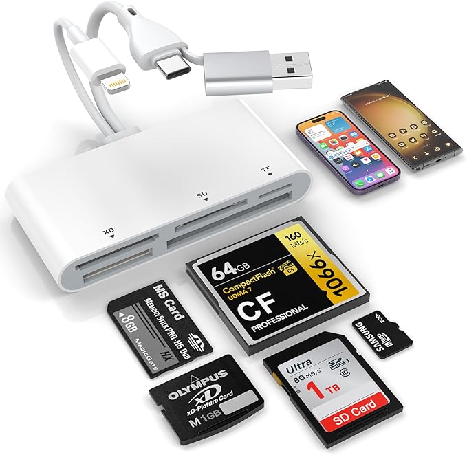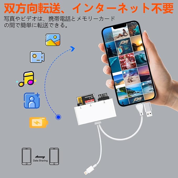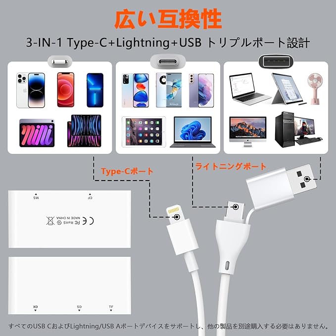 ✅【広い互換性】このiphone sdカードリーダーは、USB C、Lightning、USB Aインターフェイスを持つすべてのデバイスをサポートし、標準的な写真フォーマット、JPER、RAW、SD、HDビデオフォーマットに対応しています。対応OTG機能付きノートPC、iPhone 17/17 Pro/17 Pro Max/16e/16/16 Plus/16 Pro/16 Pro Max/15/15 pro/15 pro Max/14/14 pro/14 pro Max/13/13 Mini/13 pro/13 pro Max/12/12 Mini/12 pro/12 pro Max/11/11 pro/11、MacBook、Mac-Book Pro、ChromeBook、Dell XPS、Androidスマートフォン、i-Pad Pro、SONY XPERIA、Galaxy、Google Pixelなどのデバイス。 Mac OS、IOS、Android、Windowsおよび他のシステムをサポートし、1つのメモリーカードリーダーですべての転送ニーズを満たすことができます。