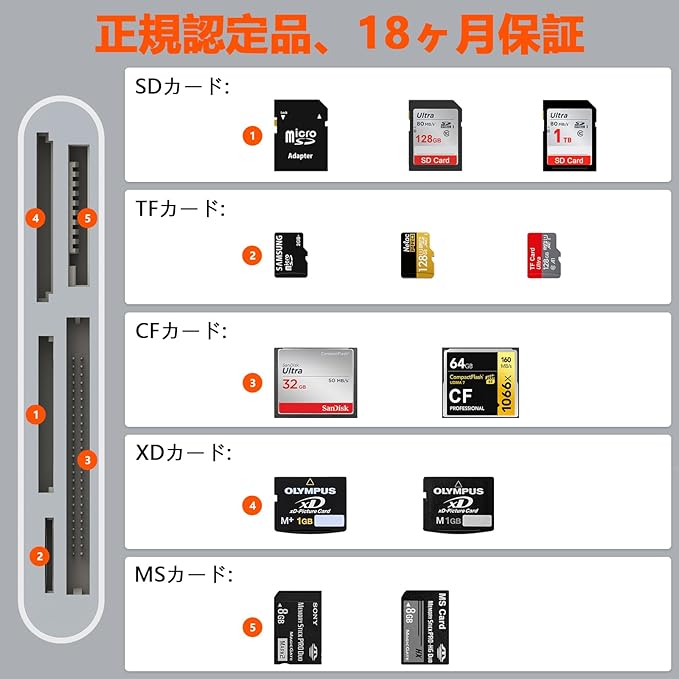 ✅【5-IN-3 カードリーダー】SDカードリーダーには、SDカードスロット(SD /SDHC/SDXC/MMC/RS-MMC) 1、TFカードスロット(Micro SD/Micro SDHC/Micro SDXC) 1、CFカードスロット 1、XDカードスロット 1、MSカードスロット 1が装備されている。 このsd カードリーダーがあれば、いつでもどこでも生活の中で見聞きしたことを共有でき、携帯電話のメモリ不足を心配する必要がありません。