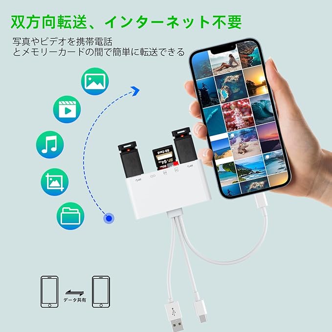 【プラグアンドプレイ & コンパクトでポータブル】iphone カードリーダーはOTG機能をサポートしており、プラグアンドプレイで、SDカードまたはUSBフラッシュドライブをスロットに挿入し、デバイスを接続して数秒待つだけで、データを表示または転送することができます。 スマホ sdカードリーダー全体は手のひらサイズなので、ランドセルやポケットに簡単に収まり、屋外での撮影に最適です。