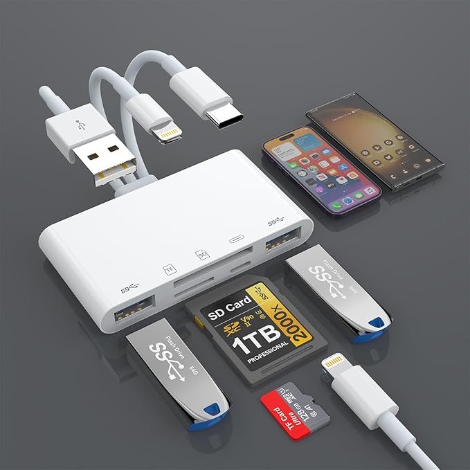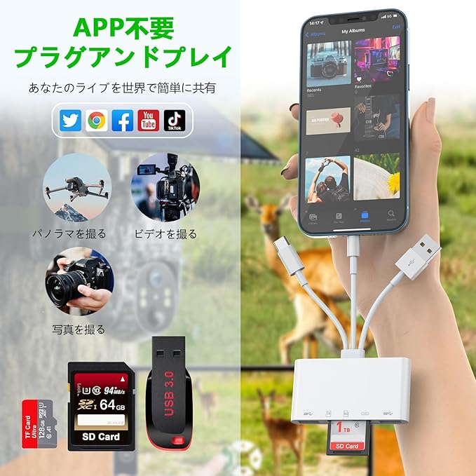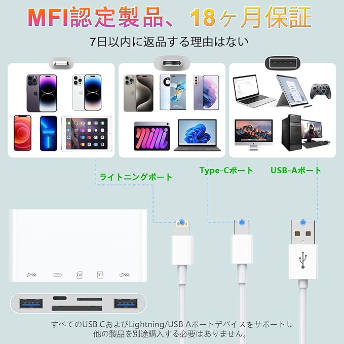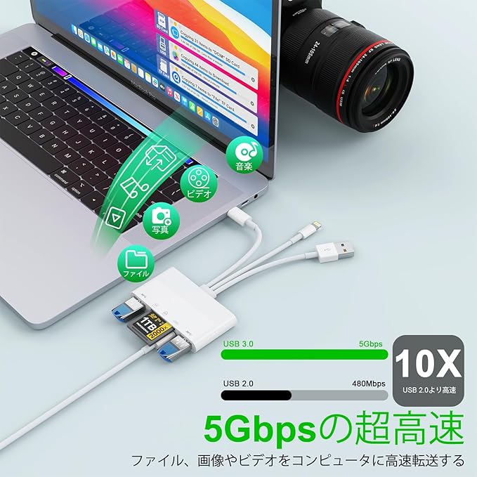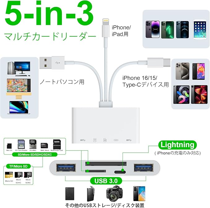 【5-in-1 カメラリーダー】2*USB ポート + 1*SDポート(SD /SDHC/SDXC/MMC/RS-MMC)+1*TFポート(Micro SD/Micro SDHC/Micro SDXC)1*Lightningポートが装備されています。マイクロsdカードリーダーを使えば、いつでもどこでもビデオや写真を共有することができ、携帯電話の容量不足や写真の多さ、外部デバイスや充電の心配もない。