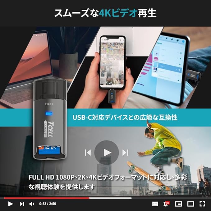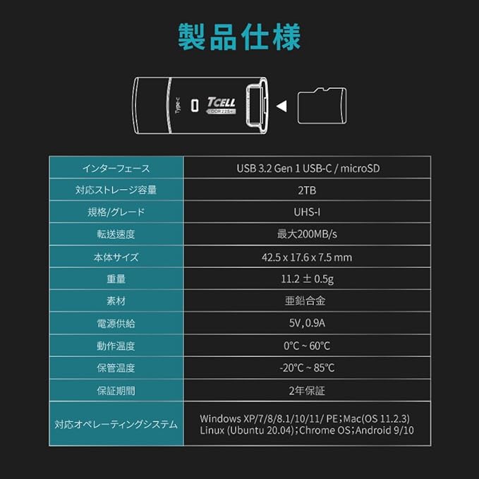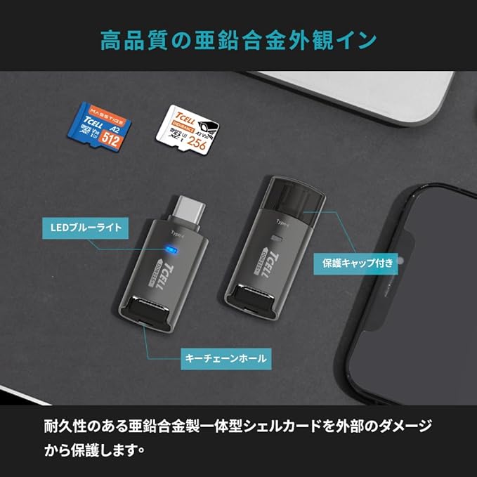【超タフネス堅固・強固ボディ/iPhone 17対応】TCELL 台湾製 ダイキャスト亜鉛合金製 Type-C接続 microSDカードリーダー 先進DDR225モード搭載 A2対応 最大200MB/s超高速転送 10Gbps OTG 対応 USB-C usb 小型メモリ iPhone/iPad Pro/MacBook Pro Air/Android/Windows PC/Linux | KAZESHOP