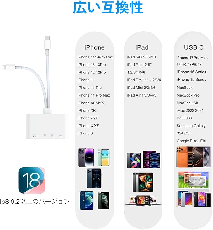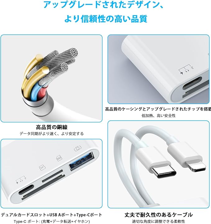 【幅広い互換性】sdカードリーダー iphoneはLightningとUSB-Cポートを搭載し、iPhone/iPad/Android/Windows/Mac OSなど主要なデバイスに対応。さらにSDカード・microSDカードに加え、USB-AポートとUSB-Cポートも備えているため、フラッシュドライブやキーボード、マウス、マイク、ゲームコントローラーなど多様なUSB周辺機器を接続できます。
