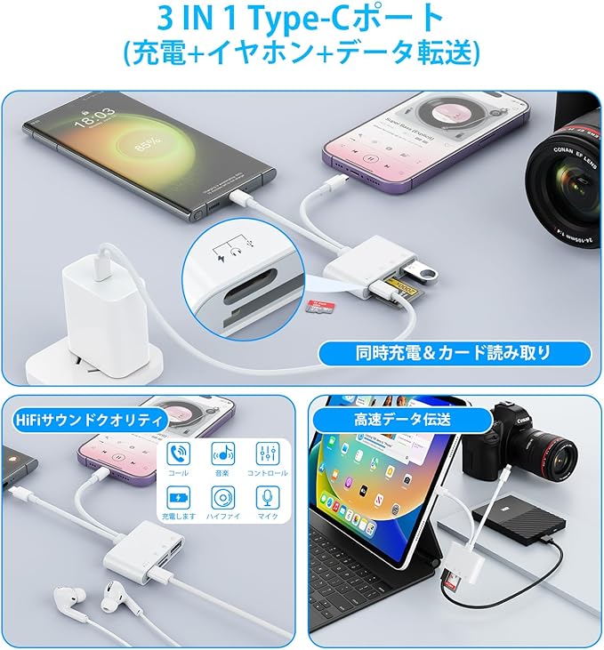 【3in1多機能Type-Cポート】iPad sdカードリーダーのUSB-C入力ポートは急速充電・データ転送・オーディオ転送の3機能に対応。充電しながらデータを移動したり、音楽を聴きながらファイルを転送するなど、同時利用が可能で幅広いニーズに応えます。