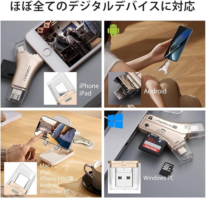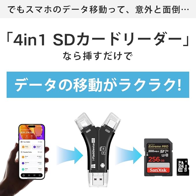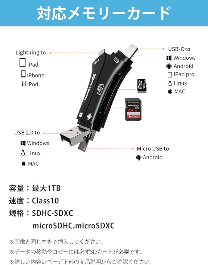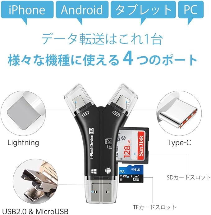 【4in1多機能カードリーダー】 IOS、Type-C、USB、Micro USBの4種類のコネクタを搭載し、SDやTFカードを簡単に読み取ることが可能。PCやOTG対応のタブレット、Androidスマートフォンとのデータ転送に最適で、これ一つでスマホの容量不足を解消します。