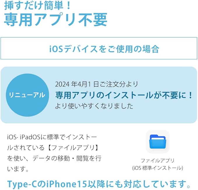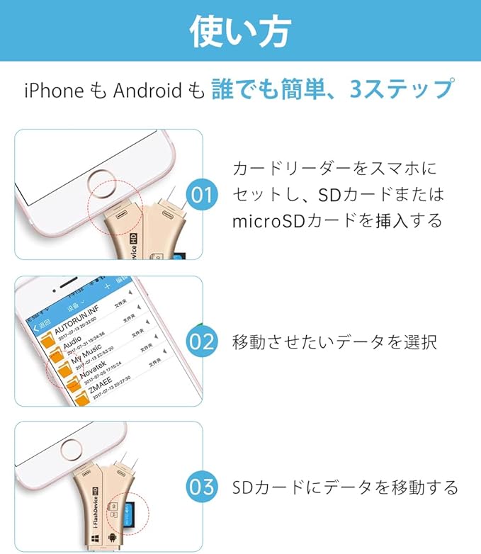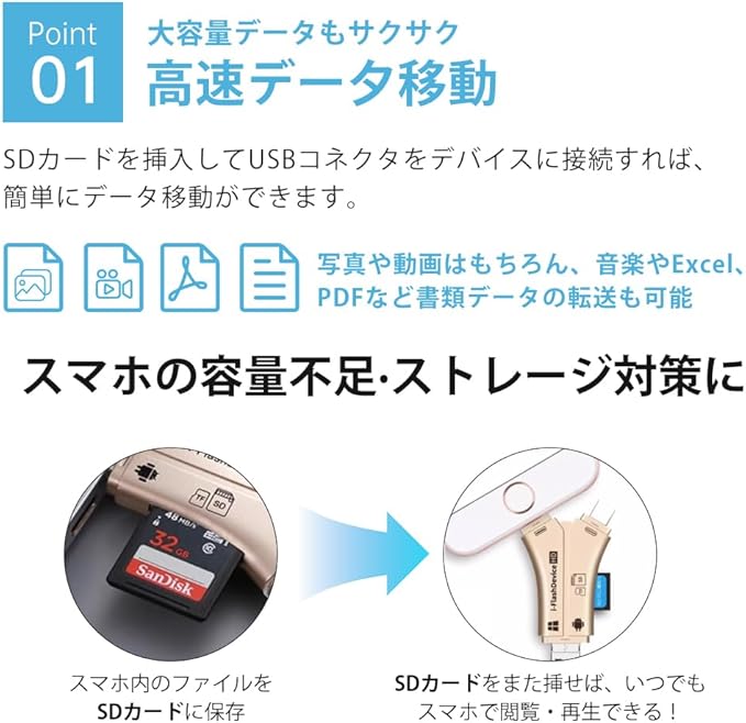 【簡単データ転送】 煩わしいアプリのインストールは不要で、カードリーダーを接続するだけで即座にデータアクセスが可能。作業効率を高め、スムーズなデータ管理を実現します。FAT32ファイルシステムのメモリーカードに対応しています。