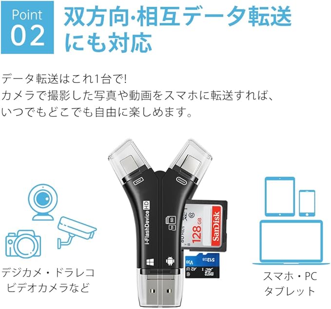 【高い互換性】 iOS 9.2~iOS 12.4のバージョンでは、カメラからPhoneやPadへの写真・ビデオ転送をサポート。iOS 13以降では、双方向のデータ転送が可能です。また、USBポートを利用して、WindowsやAndroid、iOSシステム間でのデータ交換も簡単に行えます。