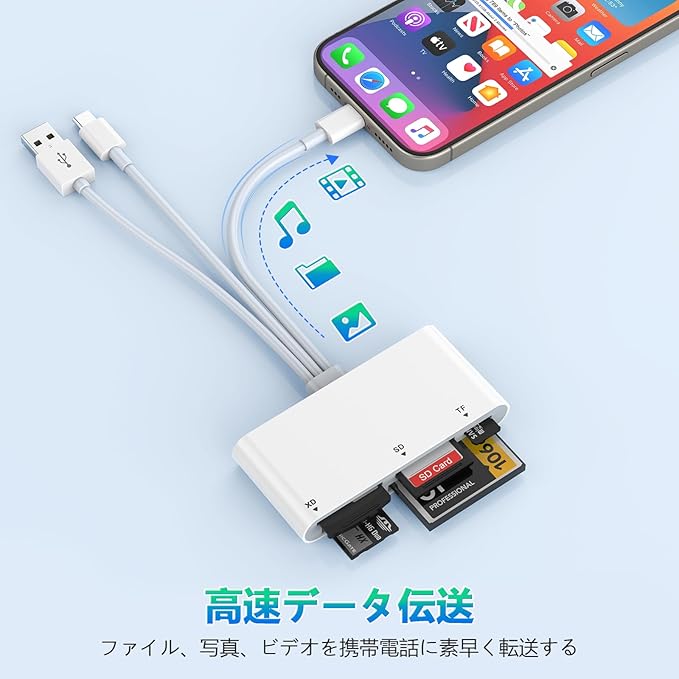 【5-in-1 スマホ カードリーダー】このSDカードリーダーは、SDカード(SD /SDHC/SDXC/MMC/RS-MMC)、TFカード(Micro SD/Micro SDHC/Micro SDXC)、XDカード、CFカード、MSカードの5種類のカードを素早く読み書きできる。 データ転送のニーズをすべて満たすことができ、メモリ容量を気にすることなく、いつでもどこでも写真やビデオを共有することができます。