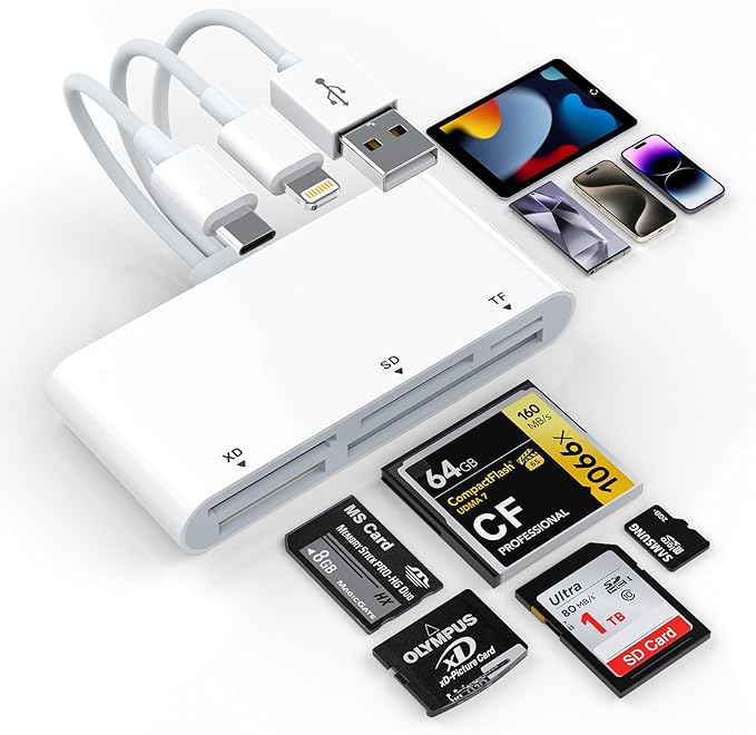 【2025安定高速版】マルチカードリーダー, 5in3 Lightning/Type-C/USB - SD/TF(Micro SD)/XD/MS/CF カードリーダー メモリーカードリーダー OTG対応 高速転送 iPhone 16/15/15 Plus/15Pro/Pro Max, MacBook Pro/Air, iPad, iMac, Android スマホ, ピクセル, PCに対応 | KAZESHOP