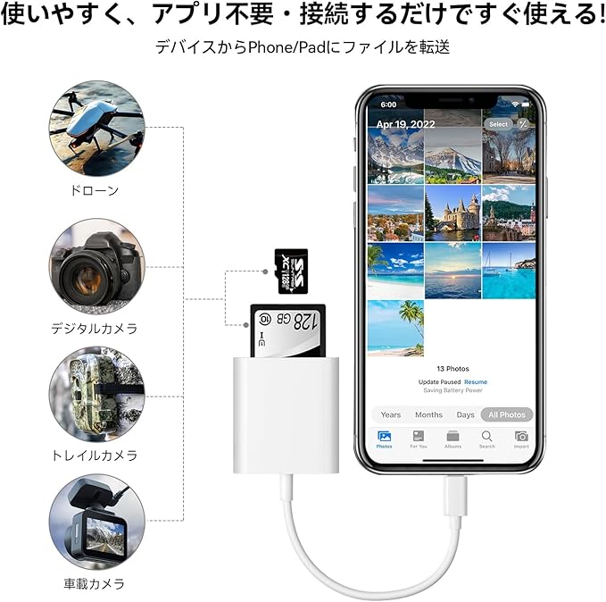 【2-in-1デュアルスロット・TF/SDカードポート】:SDカードポート(SD/SDHC/SDXC/RS-MMC/MMC-Microカード)とTFカードポート(Micro SD/Micro SDHC/Micro SDXCカード)、幅広いメモリーカードに対応し、直接にデバイスに写真や動画を転送でき、いつでもどこでも友達や家族に動画や写真を直ぐにシェアできます。