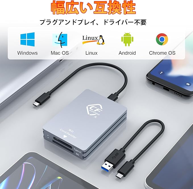✅【幅広い互換性】このCFexpressカードリーダーはWindows XP/Vista/7/8/8.1/10/11、Mac OS、Linux、Chrome OS、iOS、Androidなど主要なシステムに対応。さらにUSB Type-CだけでなくUSB Type-Aデバイスにも使用でき、ほとんどの環境で安心してご利用いただけます。