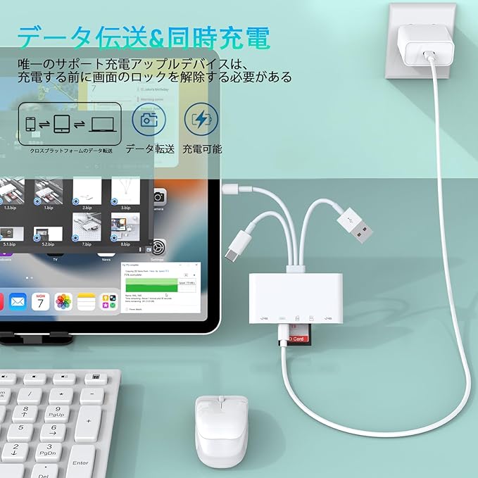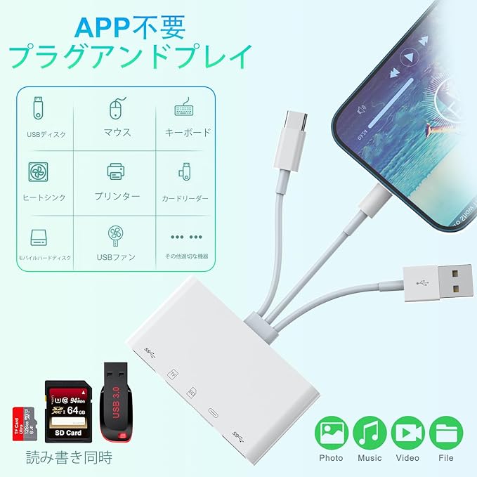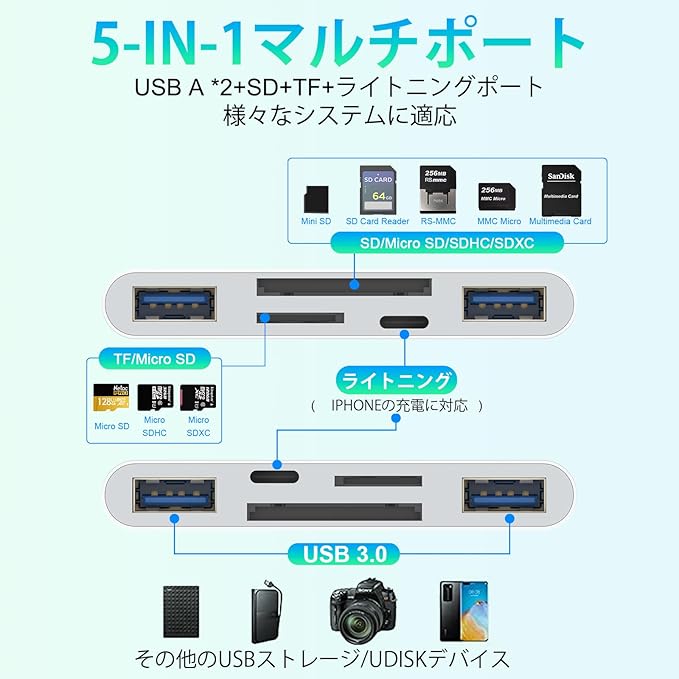 ✅【5-in-1カードリーダー】2*USB ポート + 1*SDポート(SD /SDHC/SDXC/MMC/RS-MMC)+1*TFポート(Micro SD/Micro SDHC/Micro SDXC)1*Lightningポートが装備されています。iPhone カードリーダーを使えば、いつでもどこでもビデオや写真を共有することができ、携帯電話の容量不足や写真の多さ、外部デバイスや充電の心配もない。