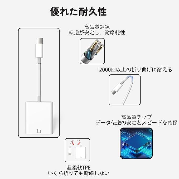 【高耐久・安心品質保証】sdカード アダプターは高品質のTPE素材を採用し、柔軟性を備えながら耐久性も優れています。内部には粗い錫メッキ無酸素銅線コアを採用、効率的な伝送と安定した信号を確保して、より快適な体験を実現します。ミニサイズで軽量で持ち運びも易いです。「30日返金保証、一年の品質保証」[SDカードは付属されていない]