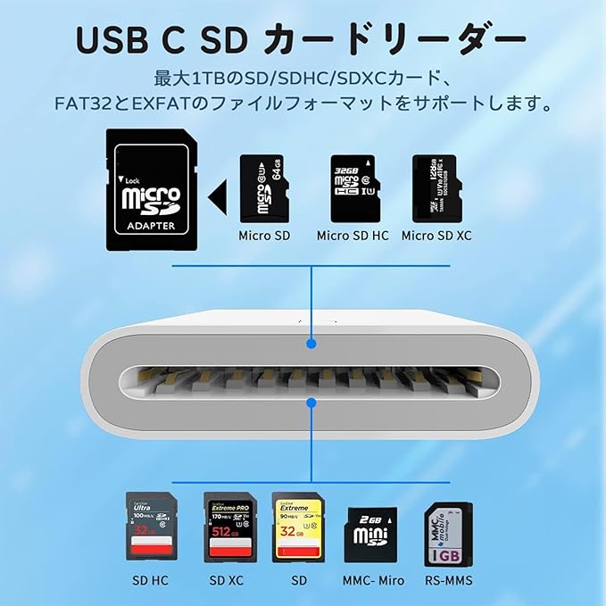 【最大1TB対応 SDカードリーダー】 本製品はSD, SDHC, SDXC, MMC, RS-MMCのカードに対応でき、アダプタ付きmicroSDカードもサポ ートしているType-c カードリーダーです。新世代チップを搭載して、最大1tb容量のsdカードを読み込みでき、大幅にUSB C機器の容量を解放します。※ご注意:Wi-Fi SDには対応できません。