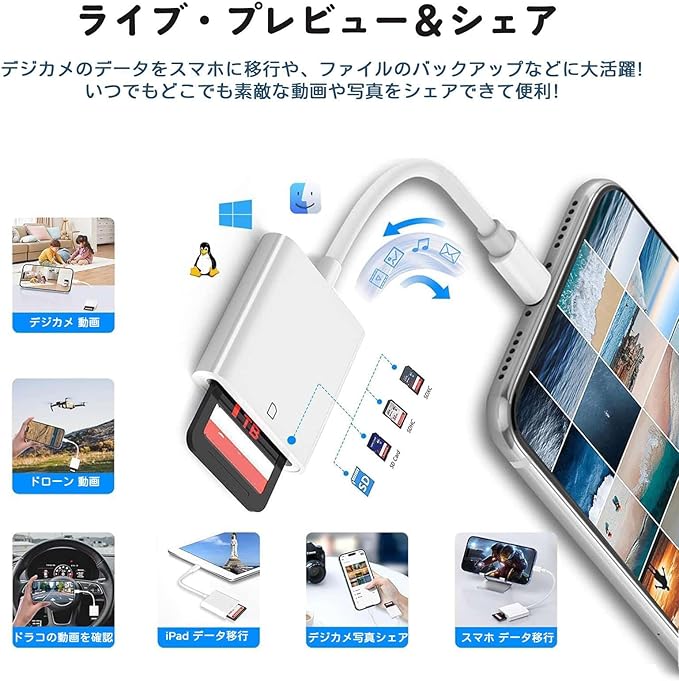 【プラグ&プレイ・双方向】スマホとUSB機器をダイレクトにつなぐ「USB OTG」機能が搭載で、専用アプリ不要、ネット環境がなくても接続するだけで、簡単にデジタルカメラで撮影した写真をTypeC スマホに転送できます。双方向データ転送はサポートしているため、スマホからカメラへの転送も簡単にできます。ドライビングレコーダー、ドローン、デジタルカメラ、モニタリング機器、などのメモリーカードデータを読み取ることができます。※一部のAndroidスマホは設定の所にOTG接続を有効にする必要です。