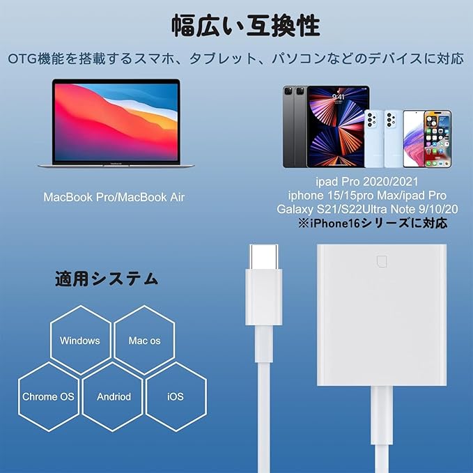 【iPhone16対応 SDカードリーダー】本製品はUSB Type-Cコネクタを搭載したsdカード スマホ転送用Type-C アダプターです。このメモリーカードリーダーはMacBookだけでなく、iPhone16/iPhone 16 Plus/iPhone 16 Pro/iPhone 16 Pro Max,iPhone15/iPhone 15 Plus/iPhone 15 Pro/iPhone15 Pro Max, iPad Pro, MacBook Pro Air, iMac Pro, Mac mini, Dell, HP, Surface Book, Xperia, Google PixelなどのType-Cポート搭載したデバイスに対応できます。※ご利用のUSB CデバイスはOTG機能が搭載している必要です。