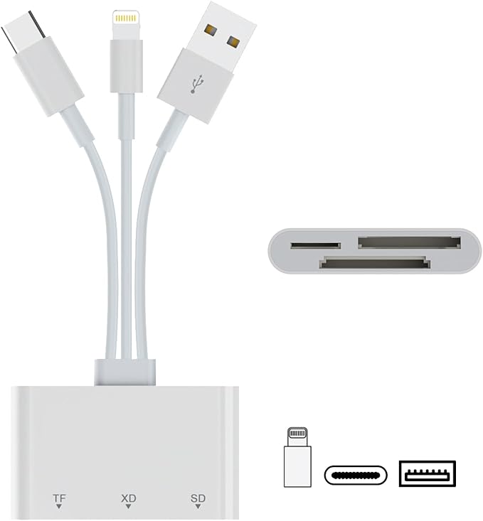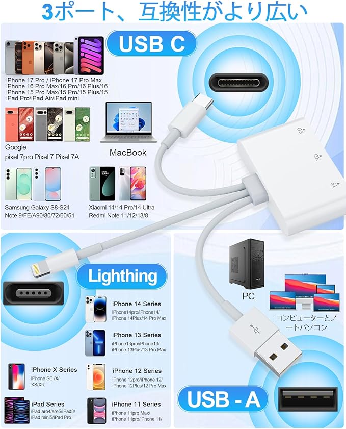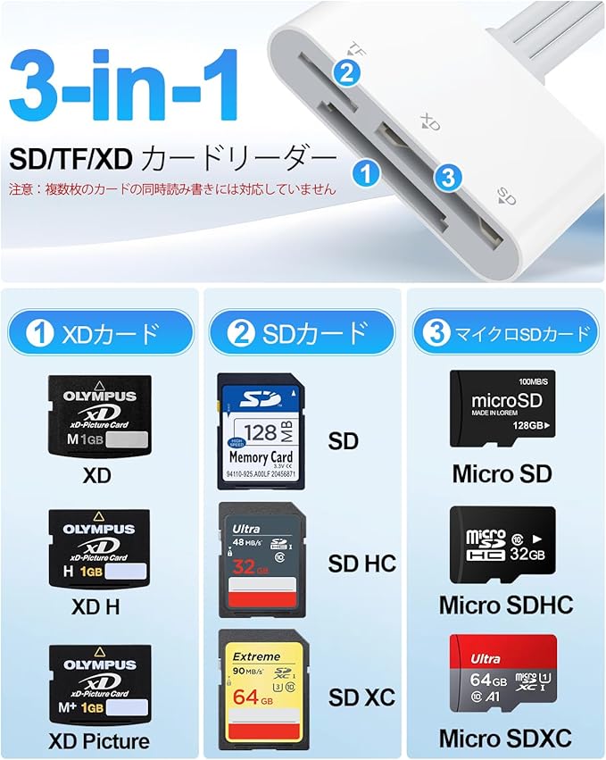 【3in1 マルチカードリーダー】メモリーカードリーダーはLightning + USB A + Type-Cの3本の出力ケーブルと、SD、microSD、XDの3つの入力ポートを備えています。ユーザーがより簡単かつ迅速に写真を転送/保存/整理できるようにします。よく使われる用途:カメラ写真の転送、機種変更時のデータ転送、ファイルの保管。