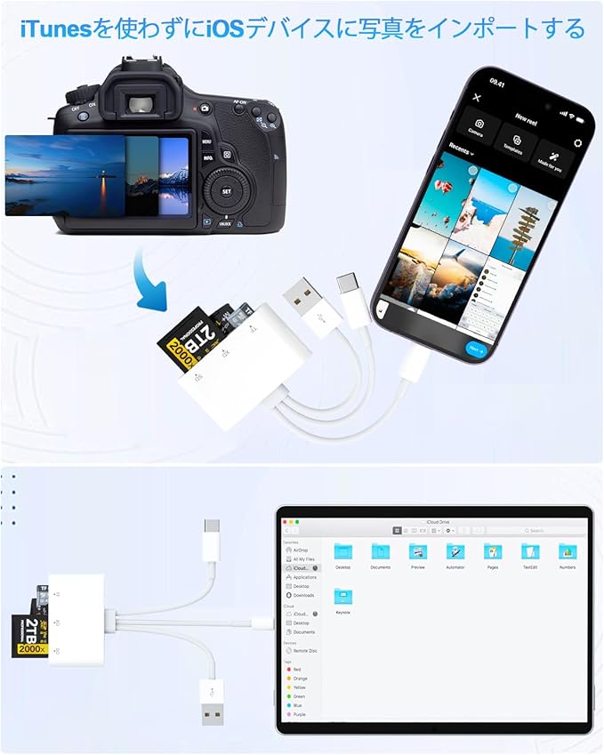【幅広い対応性】本iphone sdカードリーダーは、SDカード(SD / SDHC / SDXC、最大2TBまで)、microSDカード(microSD / microSDHC / microSDXC、最大1TBまで)、そしてxDピクチャーカード(Type M / Type H、最大2GBまで、オリンパス・富士フイルム製を含む)に対応した多機能カードリーダーです。Lightning、USB Type-C、USB Type-Aの3種類の端子を搭載しており、iPhoneやiPad、MacBook、Windows PC、Androidスマートフォンなど幅広いデバイスでご利用いただけます。ドライバ不要のプラグ&プレイ設計で、写真や動画、ビジネスデータの転送をスムーズかつ安定して行える、安心・信頼の一台です。
