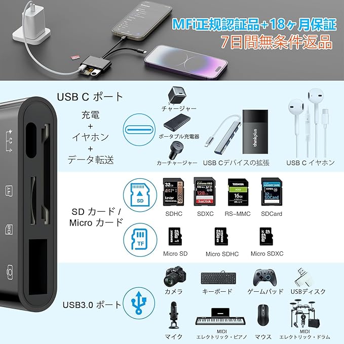 【4in1 iPhone SDカード リーダー】Lightning sdカードリーダーは最新の2025 MFI認証チップを搭載し、4種類のポート(①SDカードポート、②microSDカードポート、③フル機能Type-Cポート、④USB3.0ポート)を備えている。一般的な用途:カメラの写真転送、機種変更時のデータ転送、ファイルの保存、他の周辺機器とのUSB使用、音楽鑑賞など。