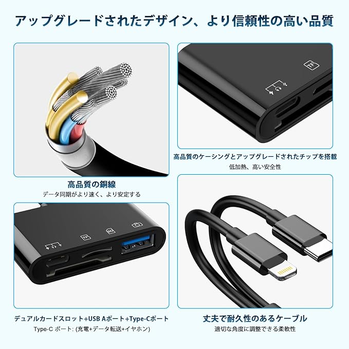 【充電しながら働く】Type-C充電ポートにより、使用中にlightning sd カードリーダーを素早く充電できます。 データ転送時にデバイスのバッテリー残量を心配する必要がありません。ケーブルには無酸素銅・アルミ箔などを組み込んだ4芯銅線を採用、過熱やショートへの多重保護機能をもち。