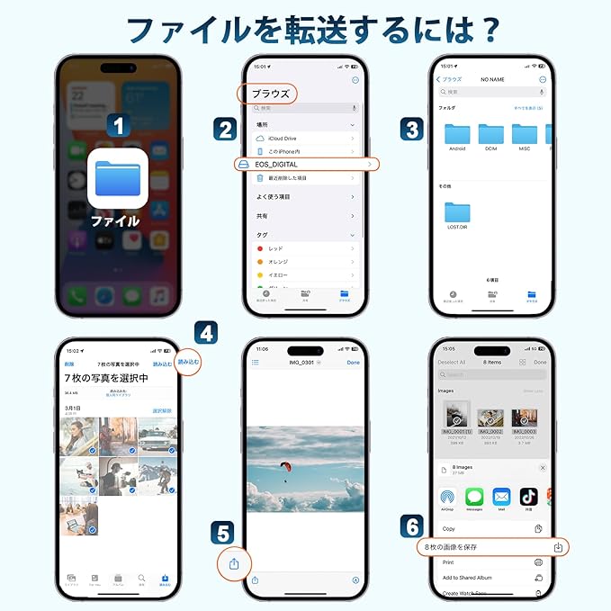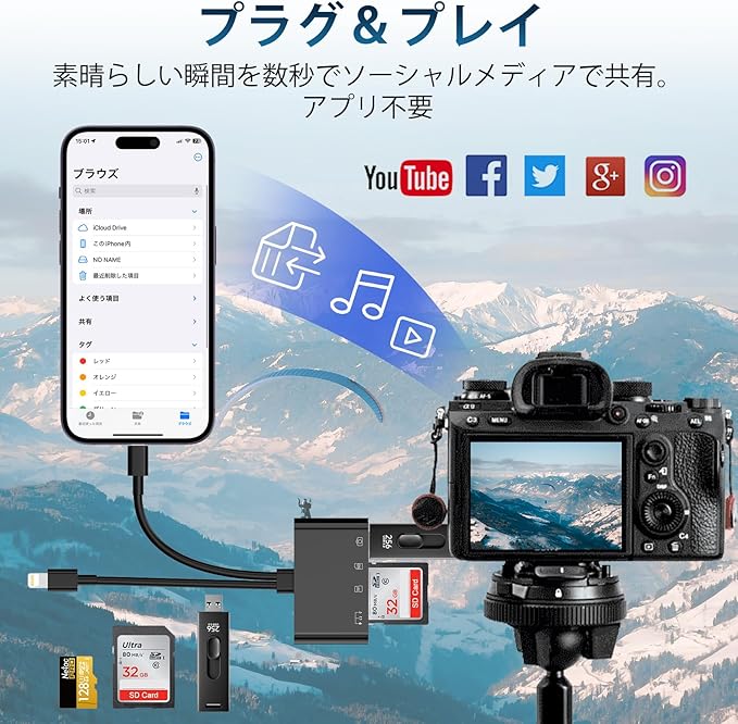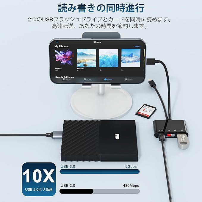 【プラグアンドプレイ、同時読み書き】PC/WIFI/Bluetooth/ダウンロードは不要。iOS標準の[ファイル]アプリからデータ転送。2台のUSBフラッシュドライブとメモリーカードの同時読み書きをサポート。 注:SDカードとmicroSDカードは同時に読み書きできません。