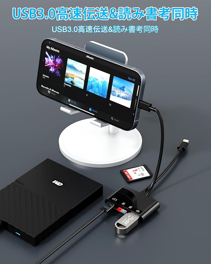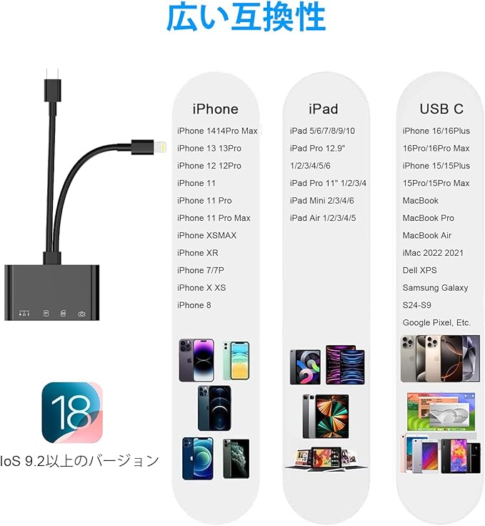 【マルチデバイス対応】USB CとLightningのデュアル出力ポートを備えたこのsdカードリーダー iphoneは、通常のカードリーダーの2倍の互換性がある。iPhone 17/16/15/14/14 pro/14 Pro Max/13/13 Mini/13 Pro/13 Pro Max/12/12 Mini/12 Pro/12 Pro Max/11/11 Pro/11 Pro Max/Xs/Xs Max/Pad Pro/Air/Mini/などに対応。USB-Cポートを備えたiphone 15/16、iPad Pro、Macbook、iMac、Google Pixel、 Dell XPSなどのPCと互換性があり、OTG機能付きの Androidスマホ、タブレットにも対応しています。タブレットからusbアダプタまで標準の写真フォーマットやJPER、RAW、SD、hdビデオフォーマットに対応しています。カメラ、キーボード、USBメモリ、カードリーダーなど、USB周辺機器を接続することもできます。