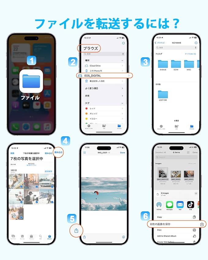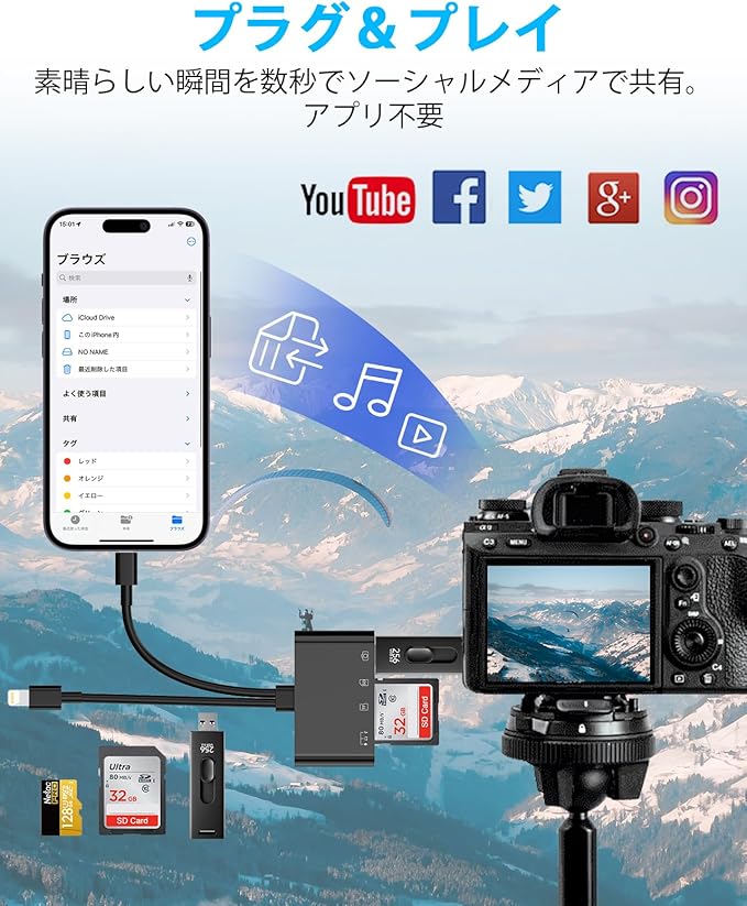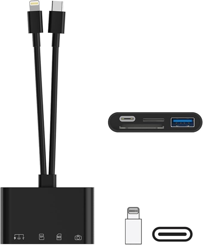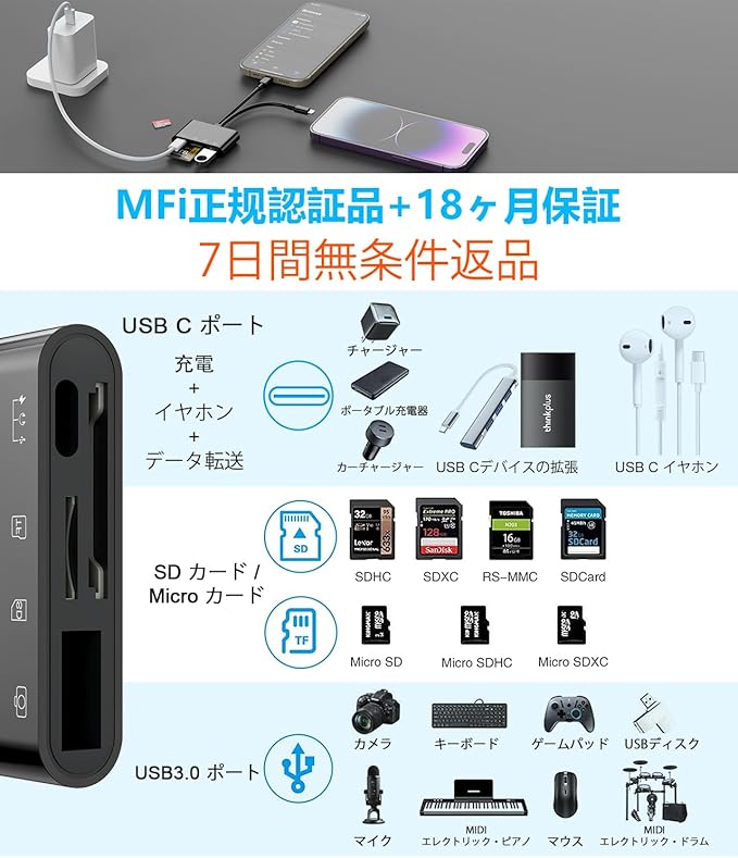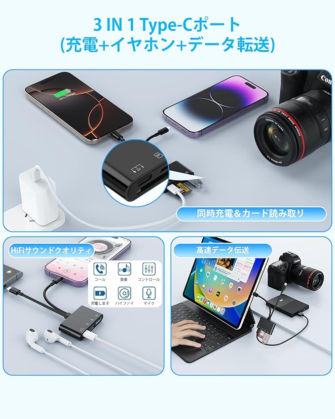 【4-in-1 カメラリーダー】3in1 Type-Cポート(データ転送+オーディオ+充電)、SDカードポート(SD/SDHC/SDXC/RS-MMMC/MMMC-Microカード)、TFカードポート(Micro SD/Micro SDHC/Micro SDXCカード)とUSBポートが搭載されて、カードやUSBメモリを挿入し読み取りと書き込みができます「ファイル」アプリを開くと、写真/ビデオ/ドキュメント(Word/PPT/Excel)/オーディオをより簡単にインポート/エクスポート双方向転送できます。1本でスマホのストレ一ジ容量不足を解決!