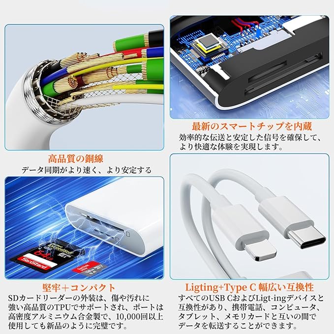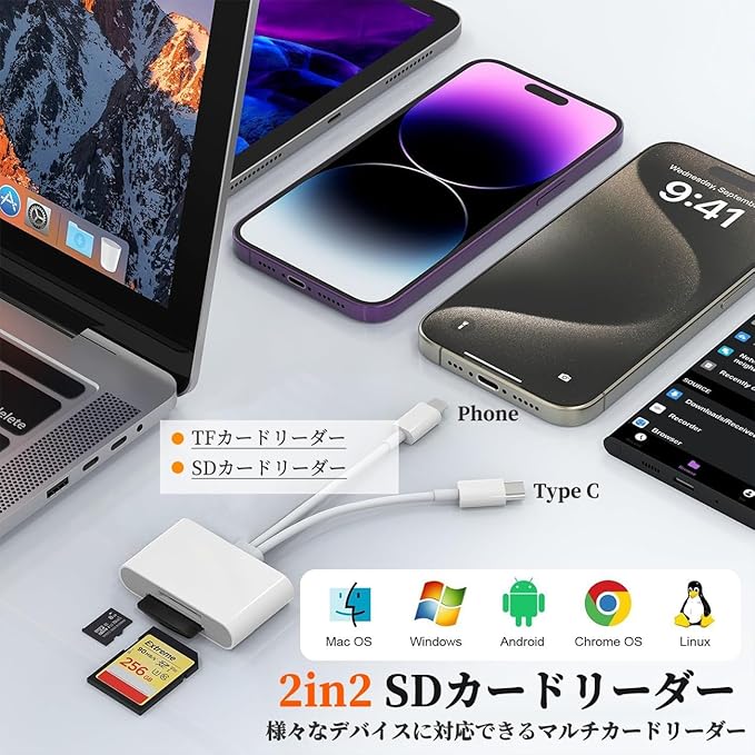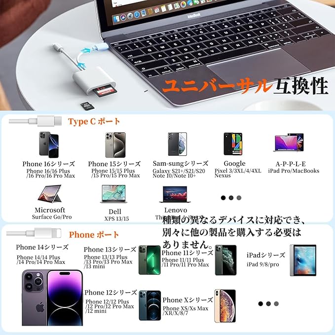 ✅ 【2025年強化版・デュアルポート対応】 SDカード(SD/SDHC/SDXC)とマイクロSDカード(Micro SD/Micro SDHC/Micro SDXC)の2つのポートを搭載。付属のPhone & Type-Cケーブルを使い、スマートフォン・タブレット・PCに直接接続可能。デジタルカメラの写真や動画を、手軽に各種デバイスへ転送できます。