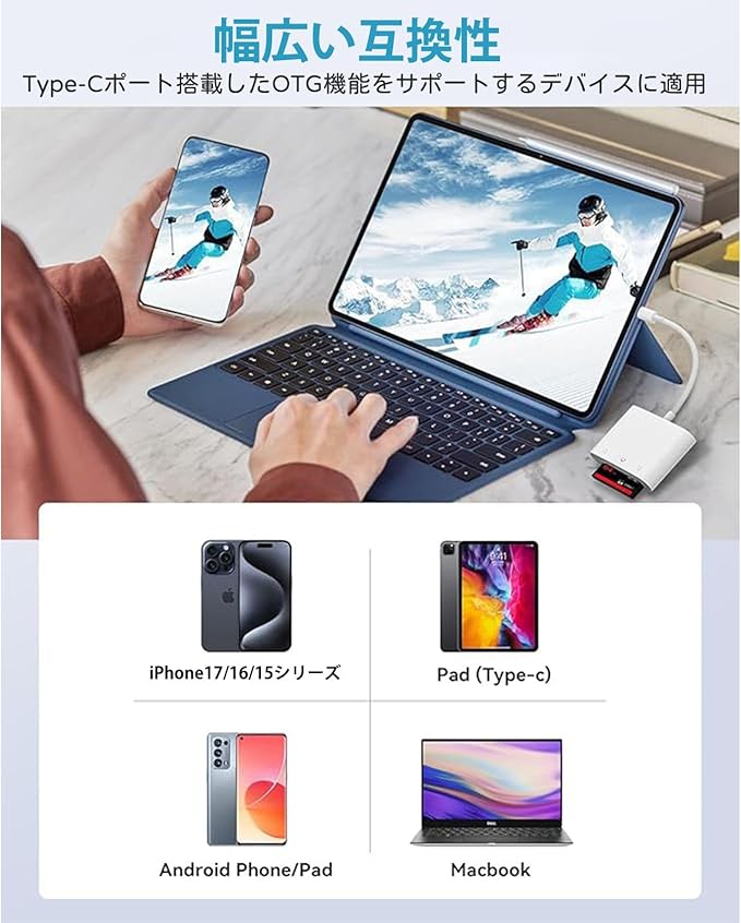 【幅広い互換性-iPhone17も対応】Windows、Mac OS、Linux、Androidなどします。iPhone17シリーズ/iPhone16シリーズ/iPhone15シリーズ/i-Pad Pro/MacBook Pro Air/MacBook/iMac Pro/Mac mini/Dell/HP/Surface Book/Xperia/Google Pixelなどと互換。※お使いのスマートフォンにOTG機能が搭載されているかご確認ください。