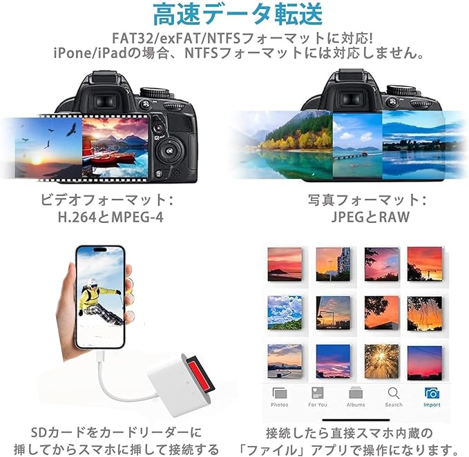 【アプリ不要・簡単操作】 OTG機能搭載して、アプリのインストールは不要で、ポートに差し込むだけでスマホへデータ転送が可能です。写真や動画の保存もスムーズに行え、初心者でも簡単に操作できるメモリーカードリーダー!プレゼントでも最適です。