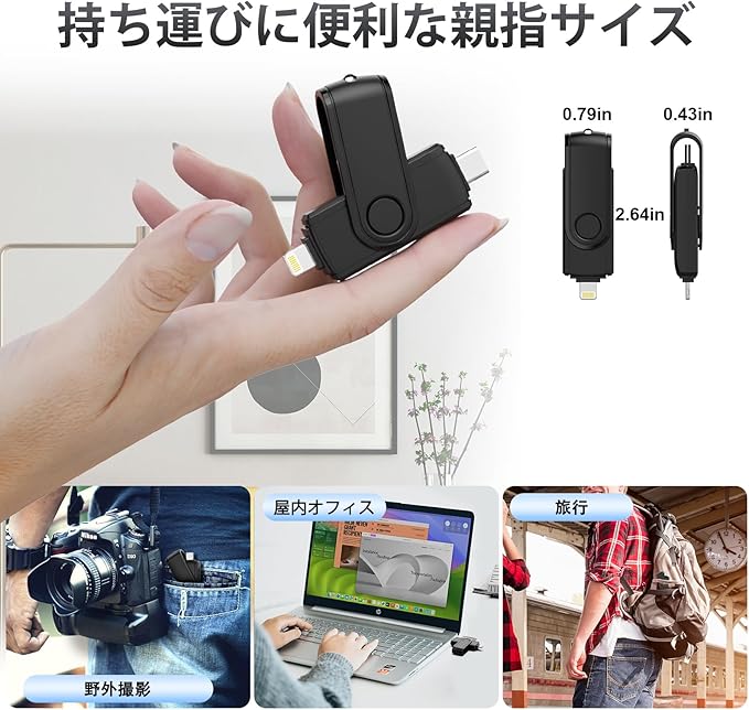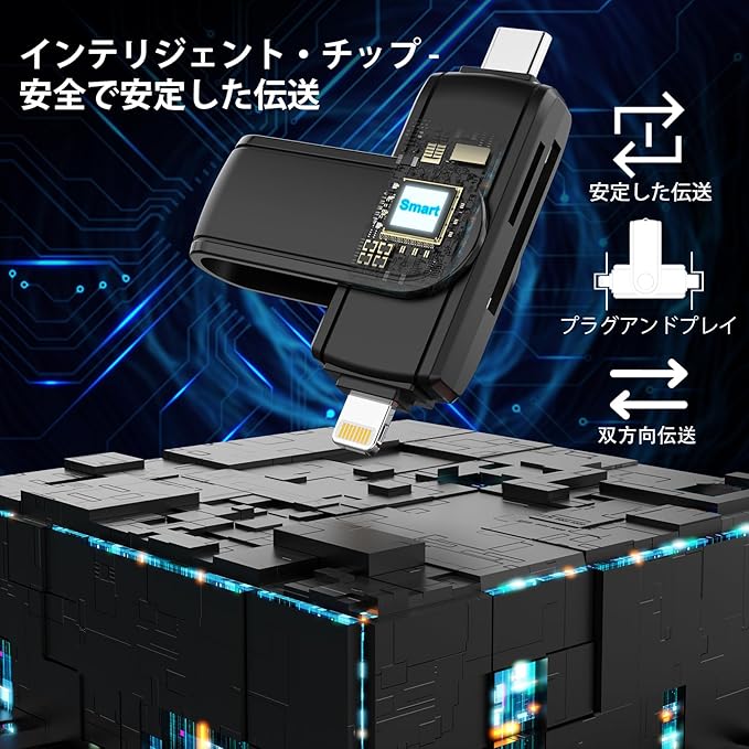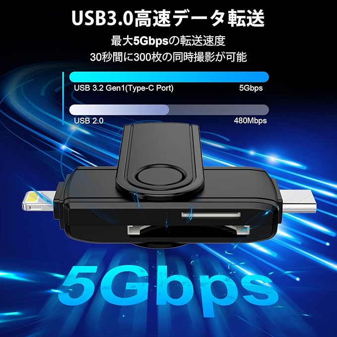 【高速データ転送、OTG対応】このLightning sdカードリーダーは、フォトアルバム、ビデオ、ムービーを5Gbps以上で瞬時に転送し、わずか30秒で最大300枚の写真を同時に転送することができます。また、Type-C/Lightning OTG機能により、いつでもどこでも、容量不足を気にすることなく、Androidスマートフォンやタブレットへの転送やバックアップが簡単に行えます。