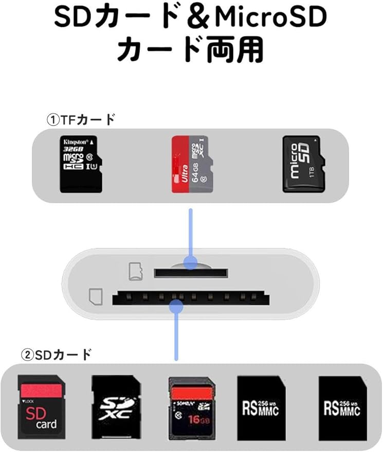 【性能の高さ】SD、Micro SDなどのカードに対応しています。iPhone14/14Plus/14Pro/14Pro Max/13/13mini/13Pro/13ProMax/12/12mini/12Pro/12ProMax/SE2/11/11Pro/11ProMaxなど、様々なデバイスに対応しています。(注意:SDカードは国際規格に準拠している必要があります。)