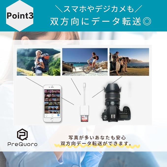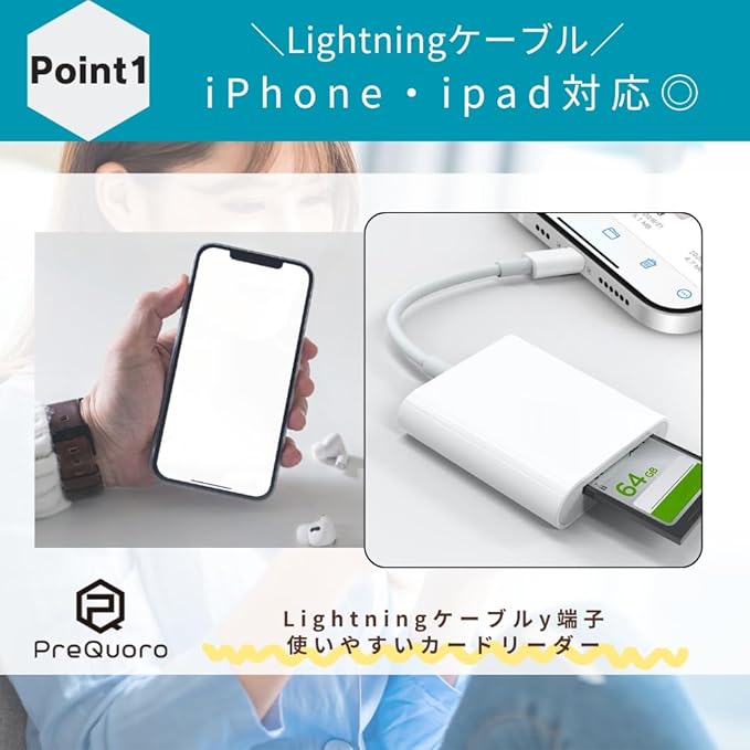 【スマホもPCもこれ一つで即変換】 PreQruooのSDカード変換USBアダプタは、Lightning・USB-C両対応で、iPhone、iPad、Android、PCにそのまま挿してすぐ使えるPlug&Play仕様。microSD・TFカード対応でカメラ写真や動画も高速転送。OTG対応で出先のデータ管理もラクラク。