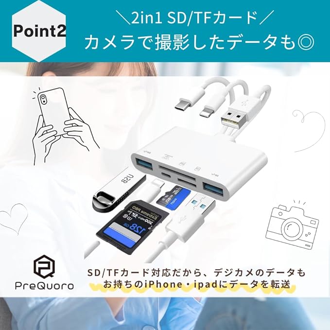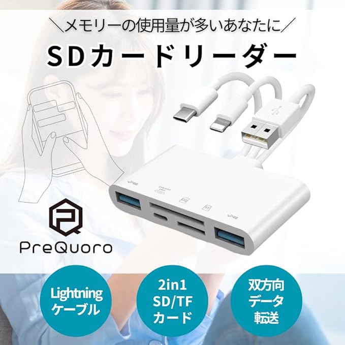 【デバイスを選ばないスマート接続】 PreQruooの多機能カードリーダーは、Lightning、USB-Cの2in1仕様で複数デバイスと簡単に接続可能。スマホ・タブレット・PC問わず差し込むだけでOK。SD/TFカードの写真・動画データを即転送でき、記録媒体変換にも活躍します。