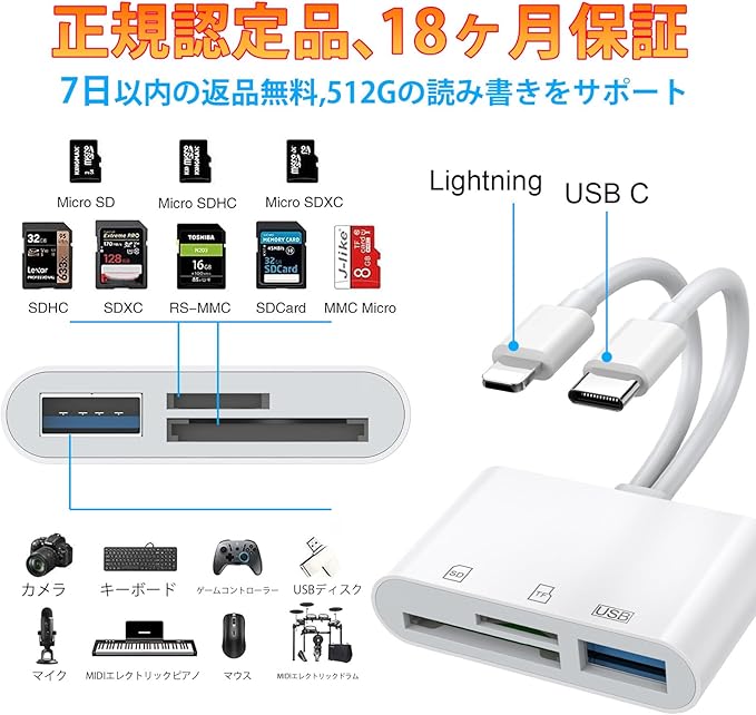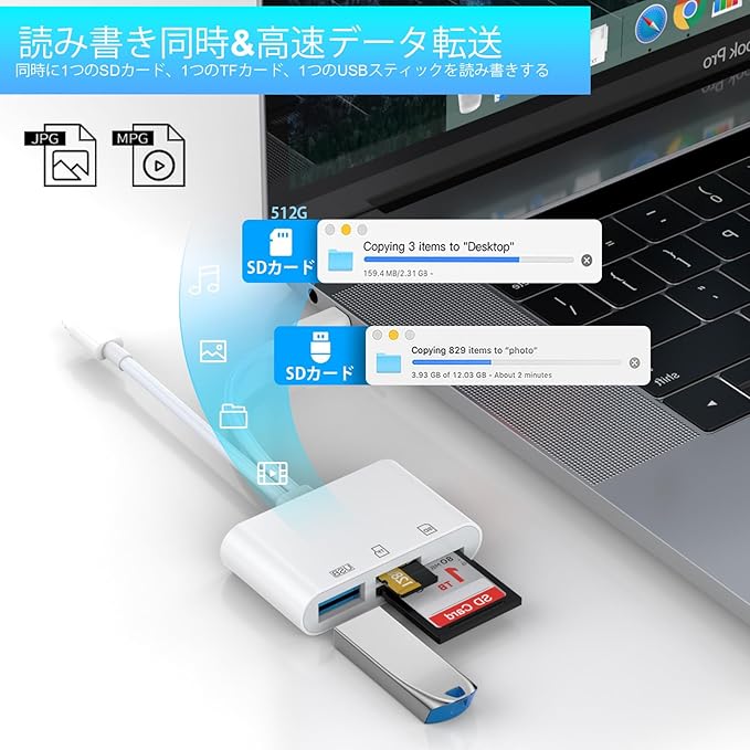 【3 in 2 SDカードリーダー ライトニング/Type-C】このカードリーダーには「SDカードリーダー」(SD/SDHC/SDXC/RS-MMC/MMC-Microカード)「TFカードリーダー」と(Micro SD / Micro SDHC / Micro SDXCカード)、「usb 変換アダプタ」.1 つのカード リーダーで複数のニーズを満たすことができます。ファイルの転送、ビデオの読み取り、周辺機器の接続など、簡単に行うことができます。※TF/SD/USBが512GBまでごサポート。