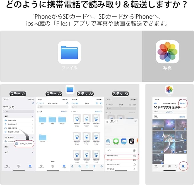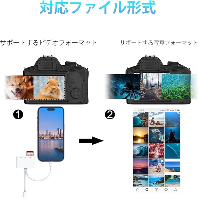 【MFi認証&高速データ転送】最新の2023年MFi認証チップを搭載し、最大312MB/sの高速データ転送で即座に同期することが可能です.サポートIOS9.2〜IOS16.bmp、jpg、png、tiff、gif、pcx、tga、exif、fpx、svg、その他の写真形式をサポート,4Kビデオの読み取りと送信をサポートします.