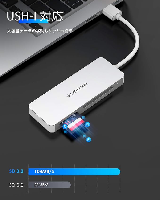 【高速データ転送】USB3.0・UHS-Iの高速規格に対応し、最大104MB/sの転送速度でパソコンとメディアの間でデータ転送できます。