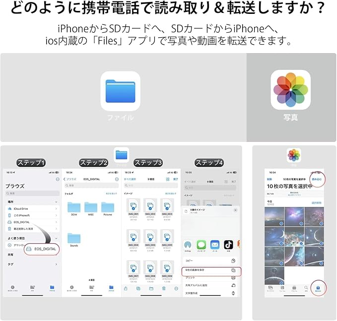 【双方向高速転送】iOS 13 - 16デバイスに適した双方向転送です。SD/TF/CFカードから電話/パッドにデータをインポート、または電話/パッドからSD/TF/CFカードにファイルをエクスポートします。ムービー、ミュージック、ワード、パワーポイント、エクセル、PDFなどを含む。最大512GBのSD、SDHC、SDXC、MicroSD、MicroSDXC、MicroSDHCメモリーカードに対応します。